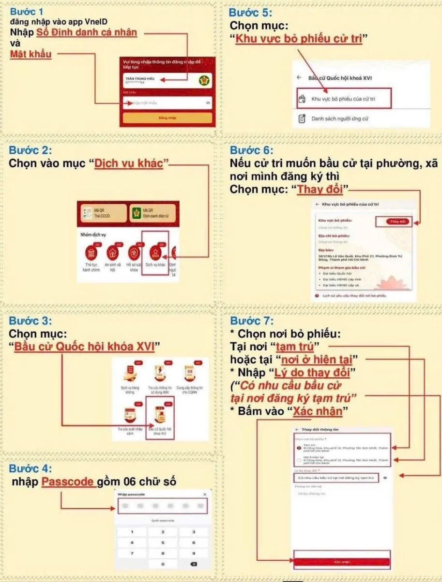 Theo đó, việc kiểm tra thông tin, thay đổi khu vực bỏ phiếu qua ứng dụng VNeID được thực hiện theo 7 bước sau: